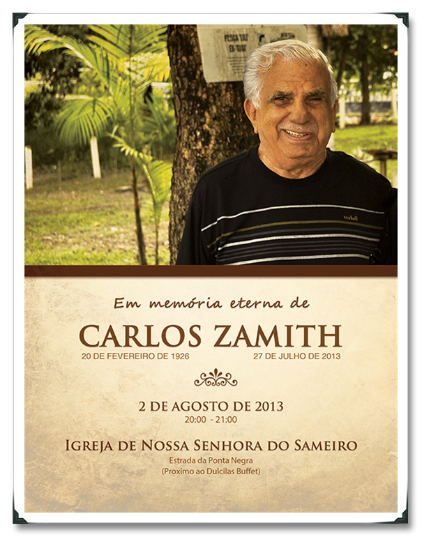 A Senhora Terezinha Teixeira de Oliveira (esposa) e seus filhos (Carlos Jr, Carlyle e Carlison), noras e netos unidos neste momento de dor e saudade convidam parentes e amigos para a celebração da missa de 7º dia do nosso querido Baú Velho, Carlos Zamith que se realizar-se-á na Igreja do Sameiro, localizada na Estrada da Ponta Negra (Proximo ao Dulcilas Buffet), hoje, sexta-feira, dia 02 de agosto, às 20 hs.