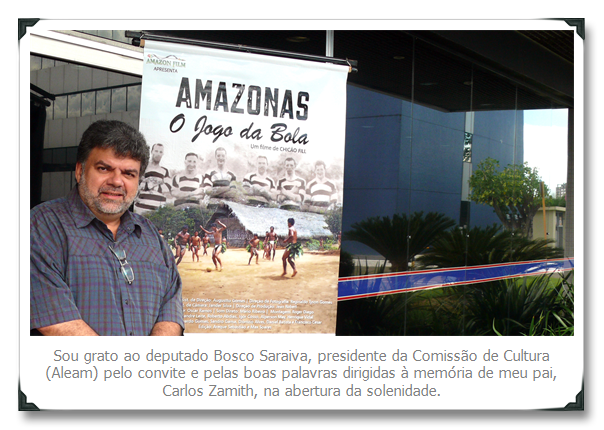 Estive nesta quinta-feira (21), na Assembleia Legislativa do Amazonas (Aleam), participando da solenidade de lançamento do filme “Amazonas, o Jogo da Bola” (80min), primeiro longa-metragem de futebol no Estado do Amazonas, sob a direção de Chicão Fill. O filme narra através de historiadores, torcedores e personalidades do futebol, os primórdios do nosso futebol até o momento contemporâneo com a construção da Arena da Amazônia. O documentário também será exibido no Cinefoot, no Rio de Janeiro, único festival da América Latina dedicado à promoção e exibição de filmes de futebol. A exibição será nesta segunda-feira (25/5), às 17h, no Espaço Itaú de Cinema, na praia de Botafogo.